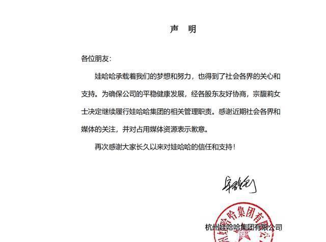 宗馥莉,真的是个狠角色! 宗庆后去世数月,因为所谓的股东对“娃哈哈集团经营管理的合理性提出质疑,使其无法继续履行对集团及其持股公司的管理职责”,宗馥莉决定辞去娃哈哈集团副董事长、总经理职务,不再参与经营管理。 真的非常果断,如果宗馥莉是软弱的性子,她可能就被拿捏了。而宗庆后尸骨未寒,如果他女儿再丢掉控制权,那娃哈哈怎么办? 然后我们看到了,“经各股东友好协商,宗馥莉女士决定继续履行娃哈哈集团的相关管理职责”,这句话背后不知多少刀光剑影。哪怕是宗庆后的女儿,她也必须证明有能力掌控企业才行。 德不配位,必有灾殃。不管是不是以退为进,宗馥莉都挺过了第一波的考验。 回头再看这件事,可谓惊心动魄,不是当机立断,有“狭路相逢勇者胜”的狠辣,而是选择妥协、忍让、苟安,那后果就难以预料了。 《声明》最后,“再次感谢大家长久以来对娃哈哈的信任和支持”也是意味深长。
